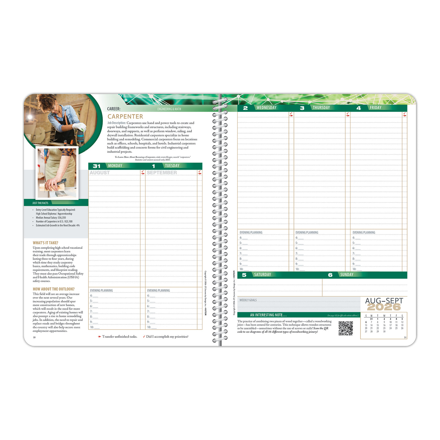 This planner emphasizes a different STEM-related topic every month of the school year. Each week features a STEM-related career and PROVIDES FACTS, STATISTICS, and OUTLOOKS related to that career—a career that could have a POSITIVE IMPACT on both their own lives and the world at large.
