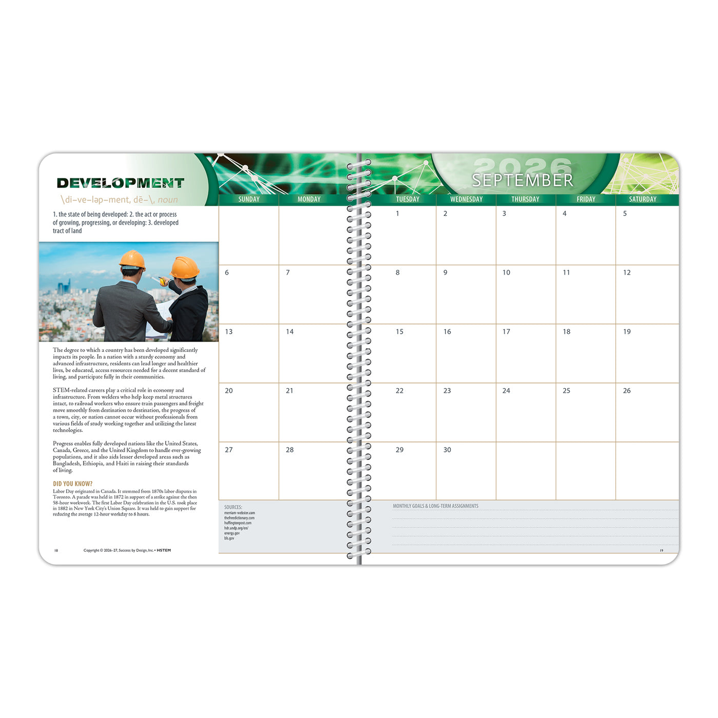 These one-of-a-kind planners emphasize a different STEM-related topic every month of the school year. Each week the various high school planner sections highlighted below teach students contemplating their futures as they approach adulthood about an associated career – one that could have a positive impact on both their own lives and the world at large.