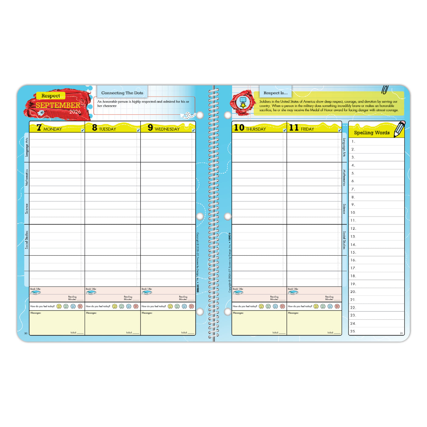 This elementary-level character education planner is in full color with a laminated front and sturdy poly-back covers. The rounded corners and plastic coil binding make it easy to use. The planner provides dedicated spaces for four core subjects: language arts, social studies, science and math. Each month, the focus is on a different character-building theme, including: